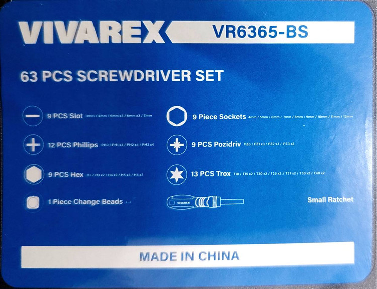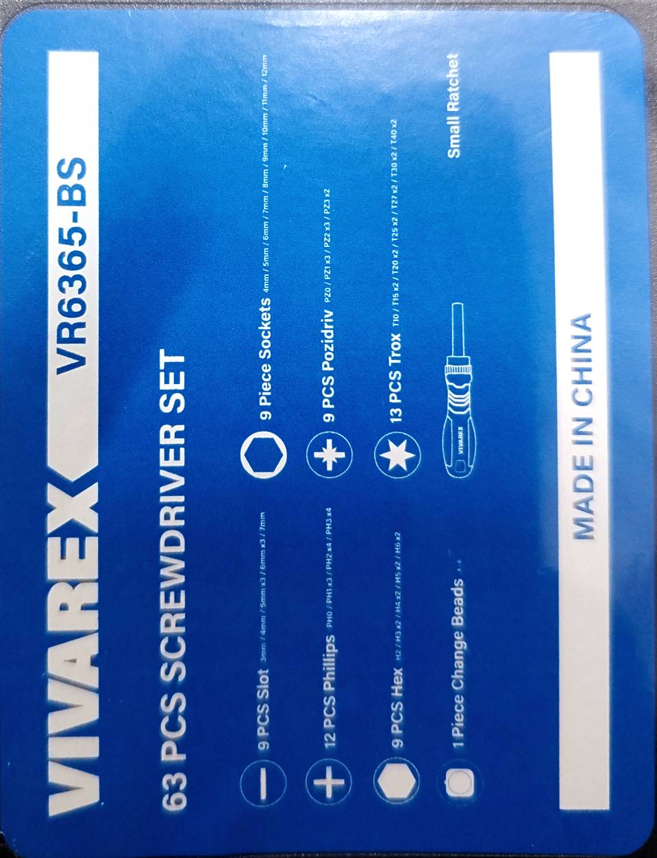 این محصول ست 63 عددی پیچ گوشتی و بیت ویوارکس مدل VR6365-BS است این محصول شامل:یک عدد پیچ گوشتی،یک عدد رابط پیچ گوشتی،۹ عدد بکس،نه عدد سرپیچ گوشتی دو سو،دوازده عدد سر پیچ گوشتی چهارسو،سیزده عدد سر پیچ گوشتی ستاره ای،نه عدد سر پیچ گوشتی چهارسو چاک دار،نه عدد سر پیچ گوشتی شش گوش است و تمامی متعلقات از جنس کروم وانادیوم (CRV) با کیفیت بالا می باشند.